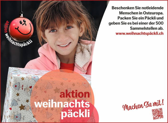 - Selbst Päckli packen: Beschaffen Sie eine der kostenlosen Normschachteln und packen Sie nach Packliste ein Päckli für Kinder oder Erwachsene. Die Sammelaktion endet am Samstag, den 22. November 2025.